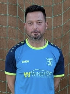 U8 Fußballmannschaft in blauen und gelben Trikots mit zwei Trainern auf einem Fußballplatz.
